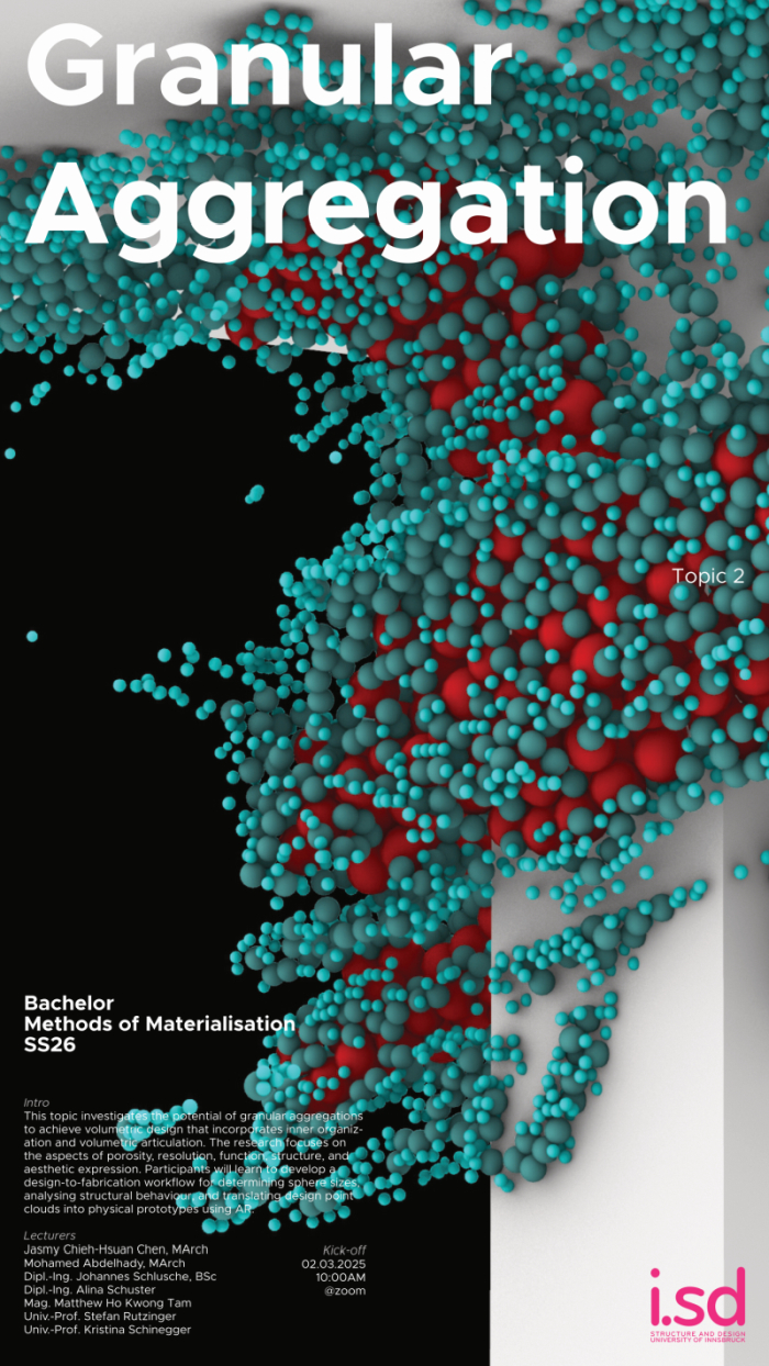 This topic investigates the potential of granular aggregations to achieve volumetric design that incorporates inner organization and volumetric articulation. The research focuses on the aspects of porosity, resolution, function, structure, and aesthetic expression. Participants will learn to develop a design-to-fabrication workflow for determining sphere sizes, analysing structural behaviour, and translating design point clouds into physical prototypes using AR.