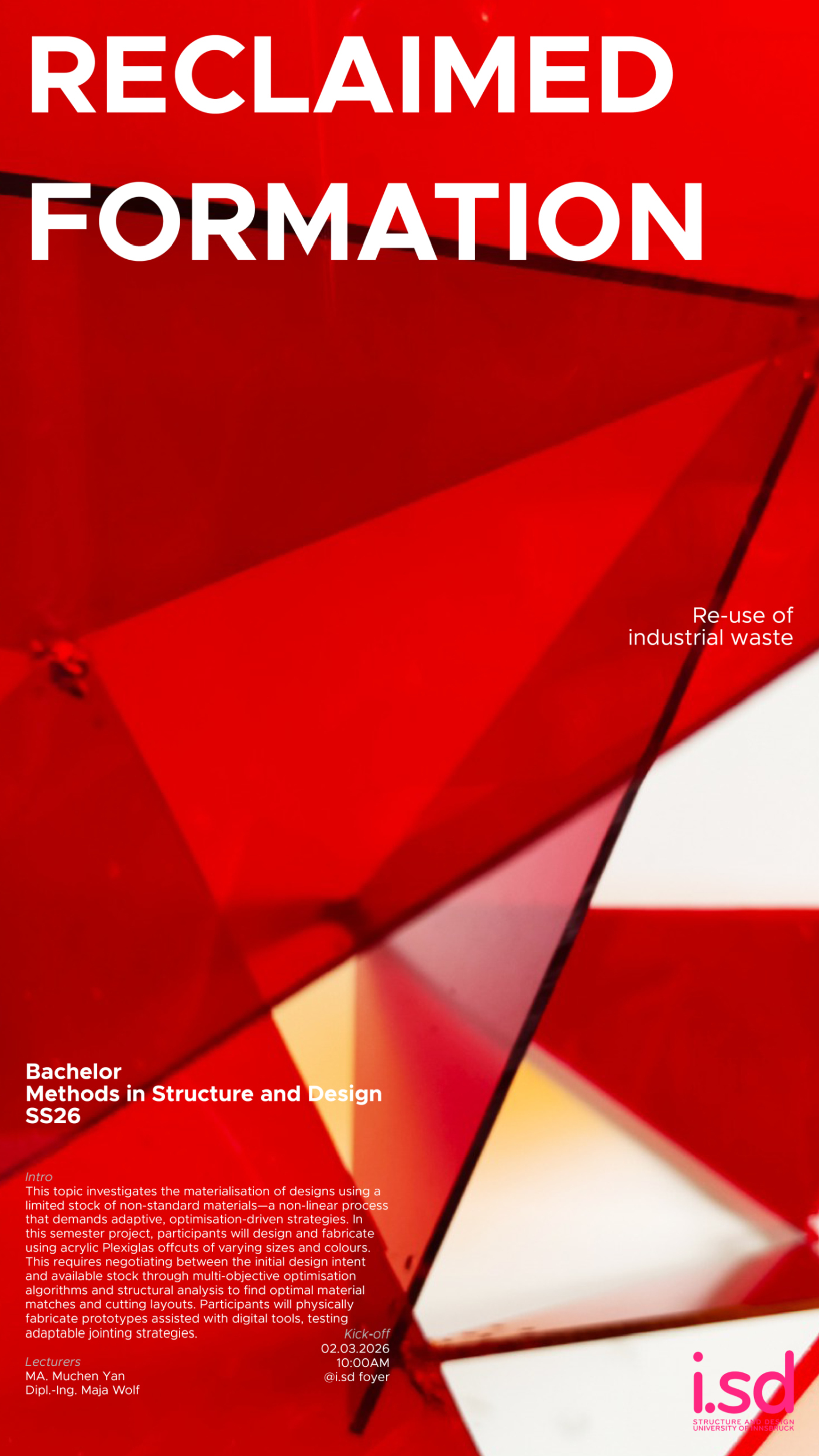 This topic investigates the materialisation of designs using a limited stock of non-standard materials—a non-linear process that demands adaptive, optimisation-driven strategies. In this semester project, participants will design and fabricate using acrylic Plexiglas offcuts of varying sizes and colours. This requires negotiating between the initial design intent and available stock through multi-objective optimisation algorithms and structural analysis to find optimal material matches and cutting layouts. Participants will physically fabricate prototypes assisted with digital tools, testing adaptable jointing strategies.